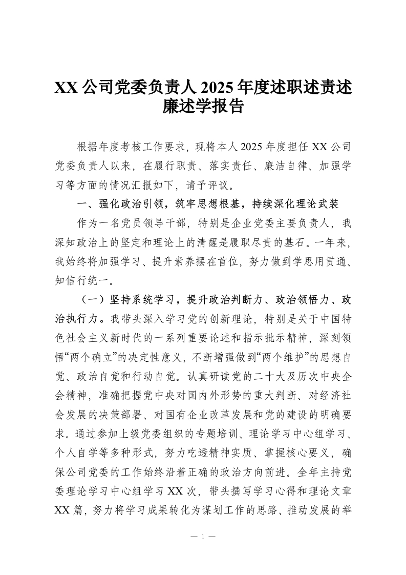 XX公司党委负责人2025年度述职述责述廉述学报告