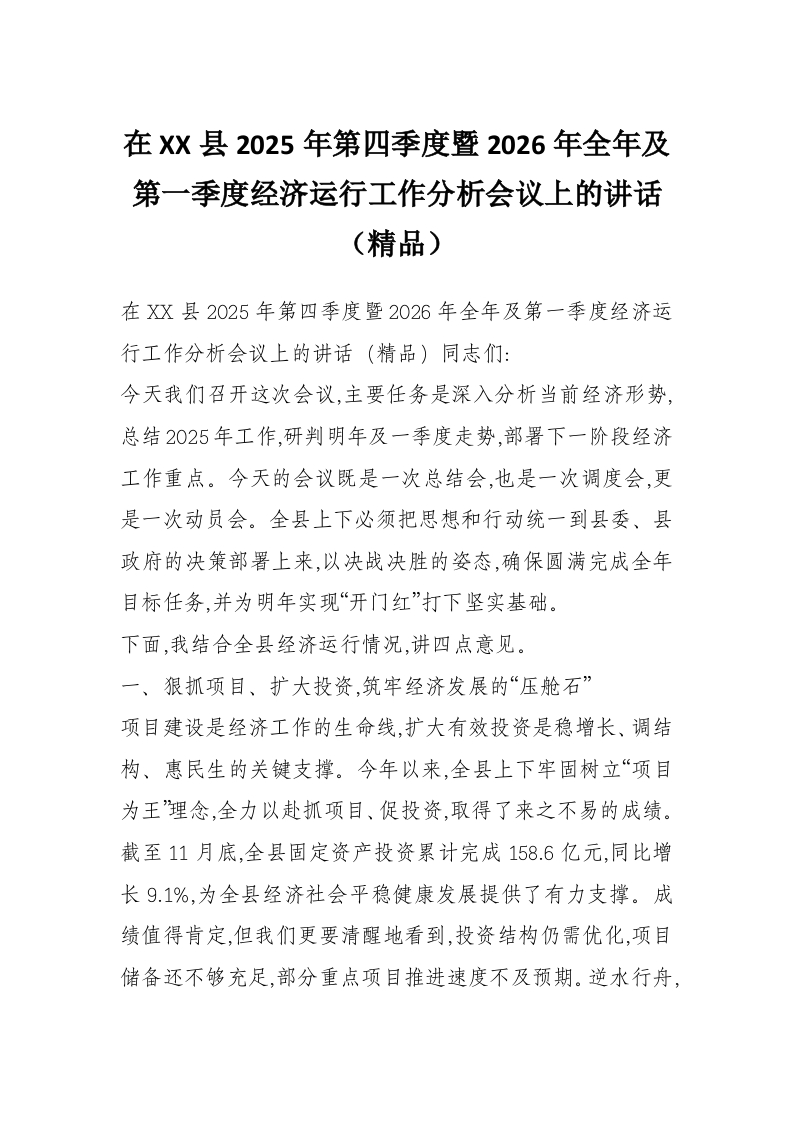 在XX县2025年第四季度暨2026年全年及第一季度经济运行工作分析会议上的讲话(精品)