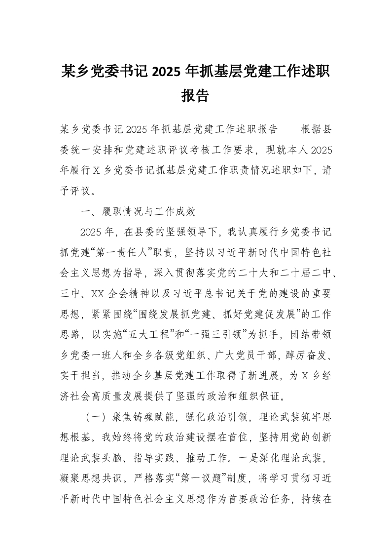 首页写作素材某乡党委书记2025年抓基层党建工作述职报告
