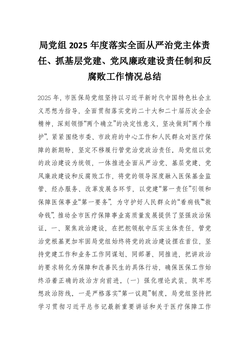 局党组2025年度落实全面从严治党主体责任、抓基层党建、党风廉政建设责任制和反腐败工作情况总结