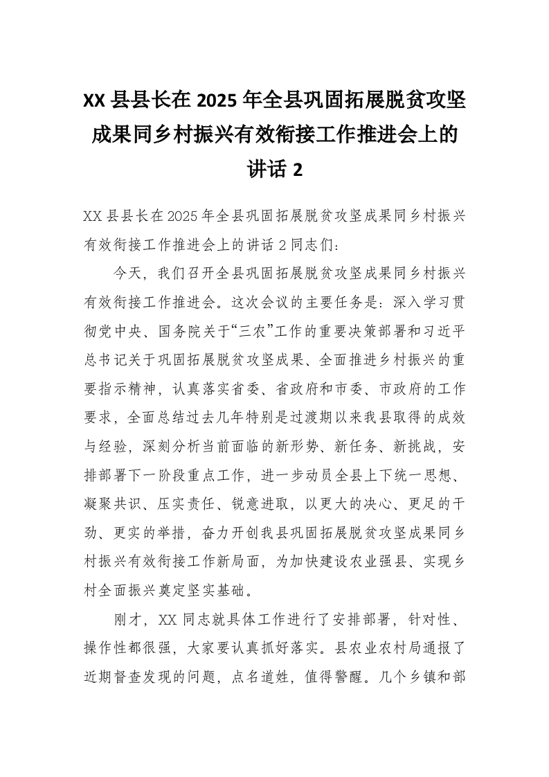 XX县县长在2025年全县巩固拓展脱贫攻坚成果同乡村振兴有效衔接工作推进会上的讲话2